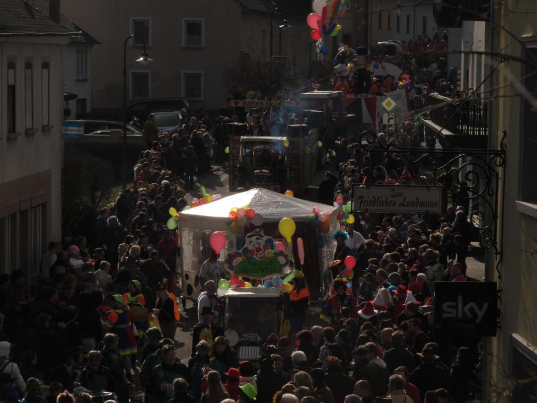 Und tatsächlich haben es die Geburtstagskinder am Sonntag geschafft, mit ihrem Umzug Kell in eine riesige Freiluftmanege zu verwandeln. Bei der Runde durch den Ort defilieren die fast 70 Wagen und Fußgruppen gleich an mehreren Stellen an einem dichten Zuschauerspalier vorbei - zum Beispiel an der Ecke Trierer Straße/Römerstraße oder später beim Abzweig in die Marktstraße. Alles in allem, so die Schätzung der Veranstalter am Ende des Tages, dürften sich 15 000 Besucher die närrische Zirkusaufführung angeschaut haben. Mit dem Keller Fastnachts-Schlachtruf "Alaaf Ole" empfängt die Menge die rund 750 aktiven Akteure im Zug, die aus 13 Orten kommen.
