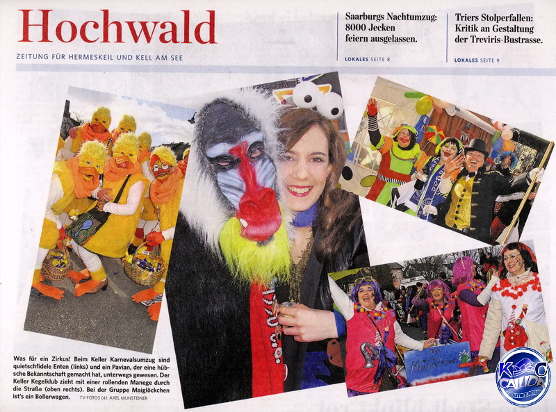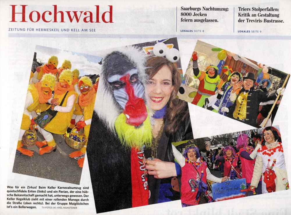 Am weitesten gereist durch Raum und Zeit ist dabei eine Römergruppe aus Oberemmel. Aus Greimerath kommt unter anderen eine Delegation aus der alten Mayakultur, die gerade noch so dem Weltuntergang entronnen ist. Wie es sich für einen Zirkus gehört, schwingt beim Kegelklub "Die Holzfäller" ein schmuck gekleideter Direktor seinen Stab.